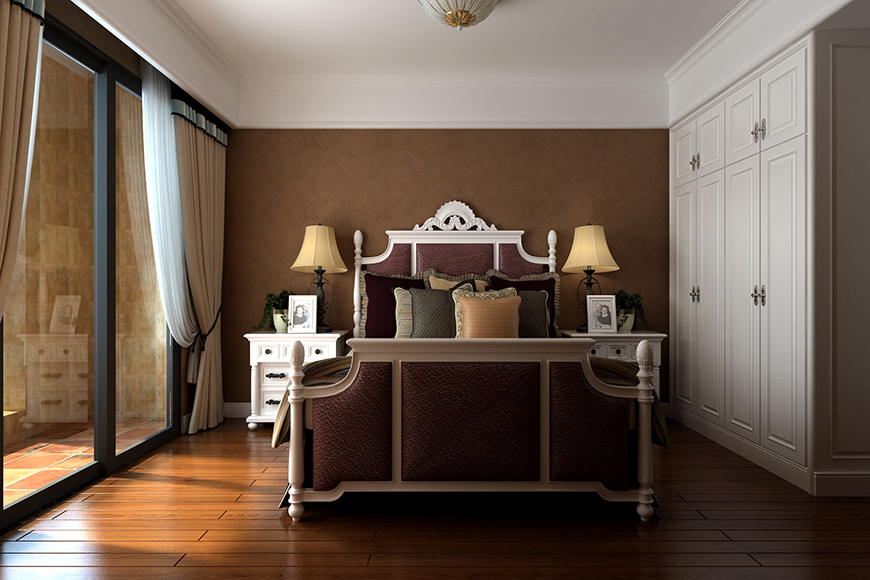 客厅以白色木作,作为基准吊顶,红色仿古砖,白色木门,给人一种浓重的美式味道,卧室有大窗户,故以深色调为主,给人一种高贵的感觉