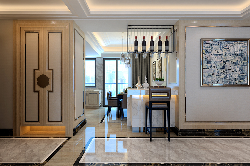本案以现代中式的设计风格为主调,在总体布局方面,尽量满足四口之家生活上的需求,主要装修材料为原木色木作饰面,以黑色不锈钢的线条装饰,搭配米白色硬包,创造一个简约又不古板的现代中式风格。